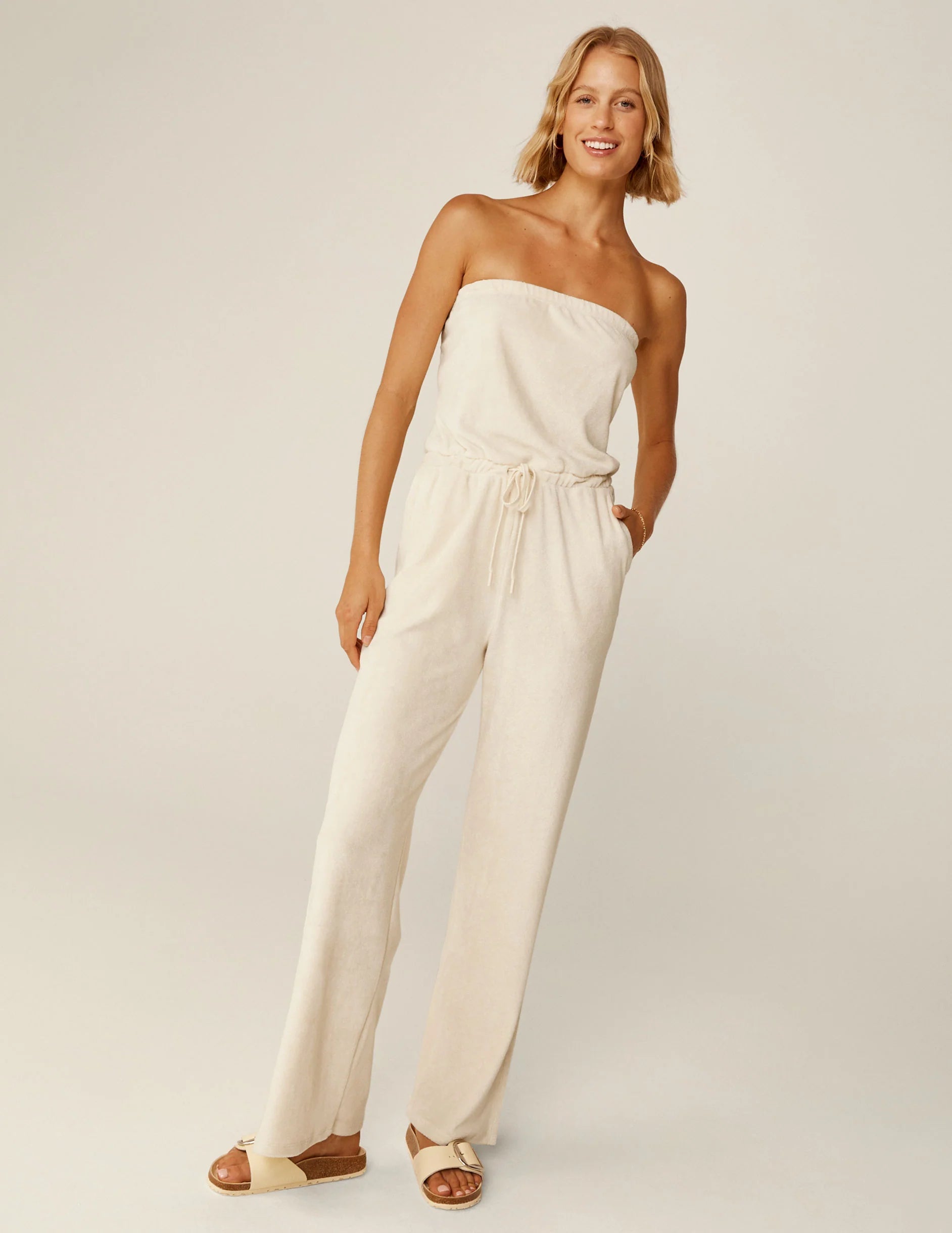This easy, comfy jumpsuit features a simple strapless neckline and front pockets, with a relaxed fit to match your vacay mindset. Throw it over your favorite swimsuit for lunch by the beach, or dress it up with accessories for dinner at the resort.
